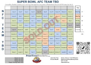 This is a fundraiser for the Dogwood Invitational Bowing Classic. You can purchase a square on our Super Bowl LVII AFC vs NFC football game board. Squares are $10 each. Payouts are $125 for Q1, Q2, Q3, and Final Game Score. AFC and NFC ending score digits will be randomly selected the morning of Super Bowl Sunday, Feb 12, 2023, and posted live on our Dogwood FB Group page. https://www.facebook.com/groups/dogwoodbowl
